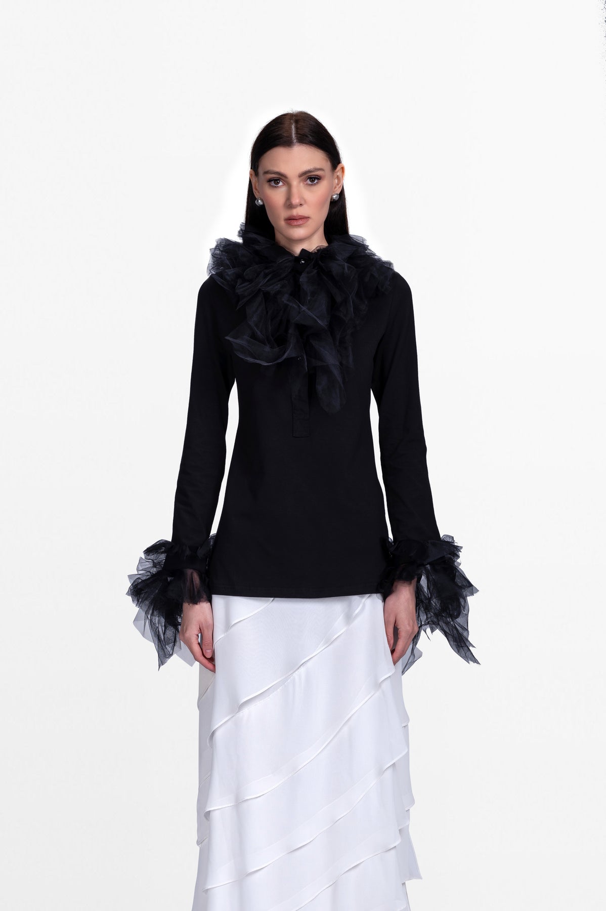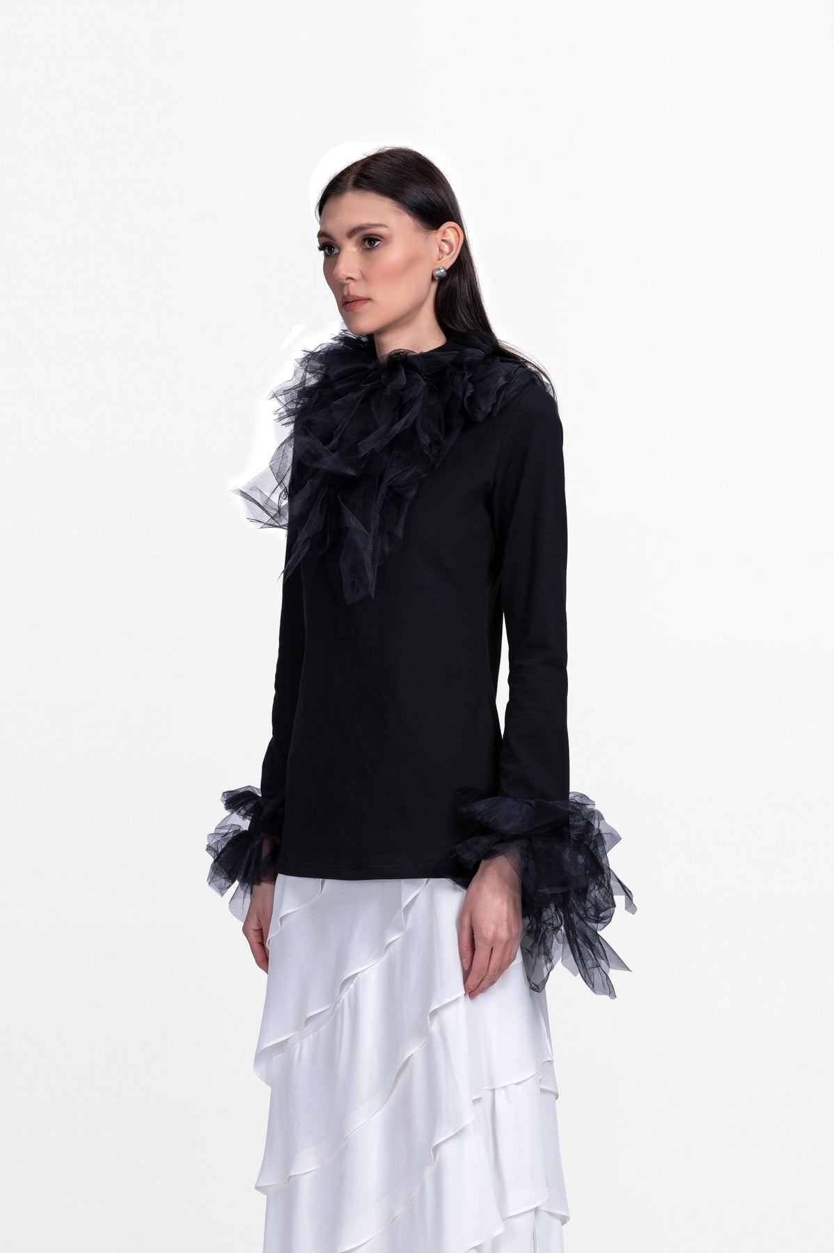 Make a bold yet feminine statement with the FAZZALI Fluffy Tulle-Trimmed Blouse, featuring a dramatic tulle collar and sleeves delicately trimmed with soft, fluffy tulle. This elegant blouse adds volume, texture, and couture-inspired detail to any look, perfect for fashion-forward daywear or elevated evening styling.