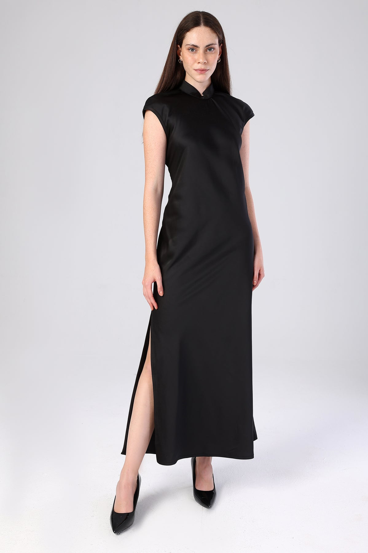 A quiet dialogue between grace and strength. The Solace Dress by FAZZALI draws its power from restraint, a sculpted silhouette defined by clean lines, a high mandarin collar, and an effortless side slit that reveals motion beneath stillness.