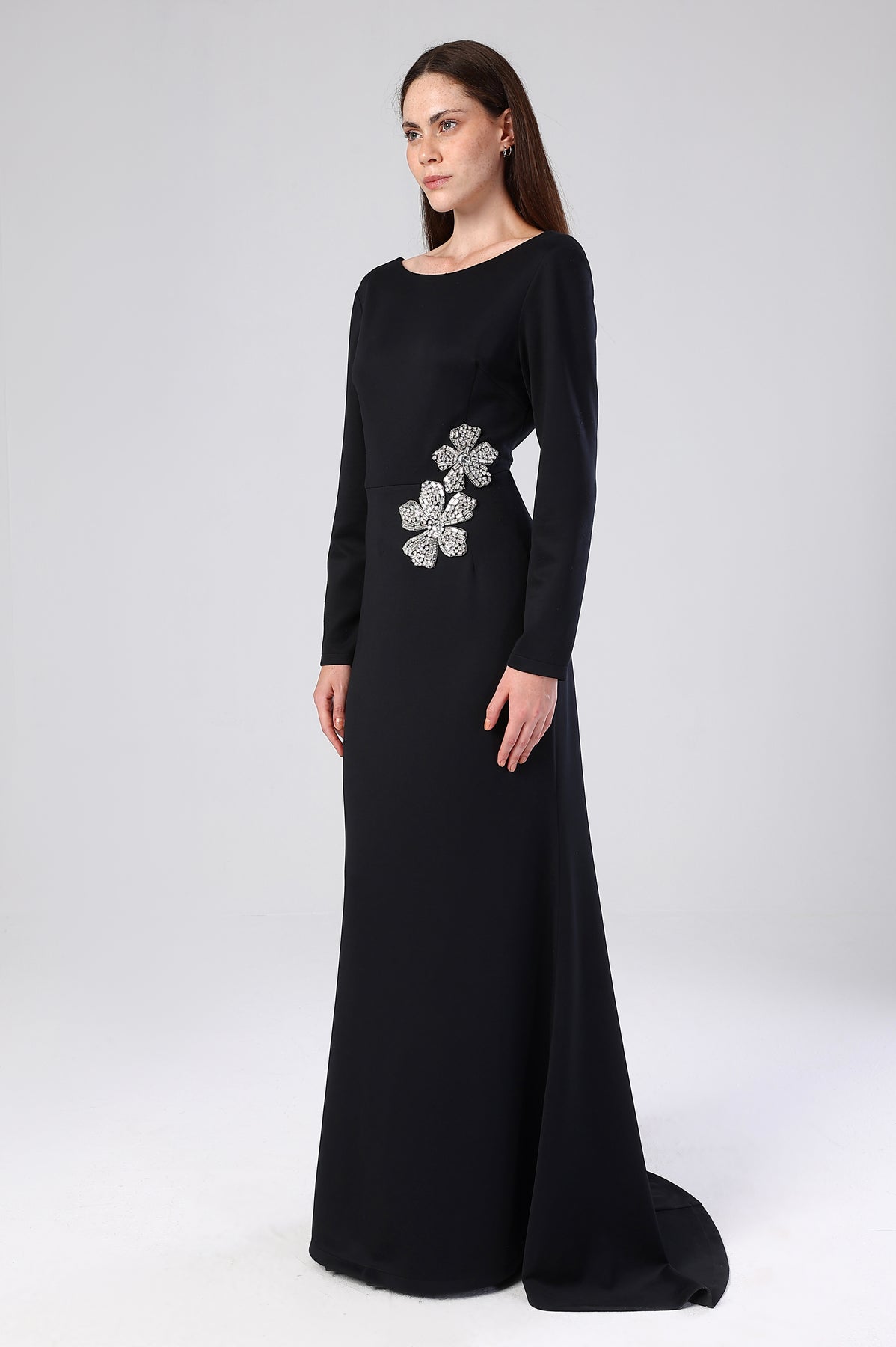 Soft elegance, illuminated. The Lueur Dress by FAZZALI embodies refined sophistication with a whisper of sparkle. Crafted from a fluid, luxurious fabric, its A-line silhouette glides with effortless grace. Meticulous rhinestone embellishments trace the waist on one side, catching light subtly, offering a quiet glint that elevates understated glamour.