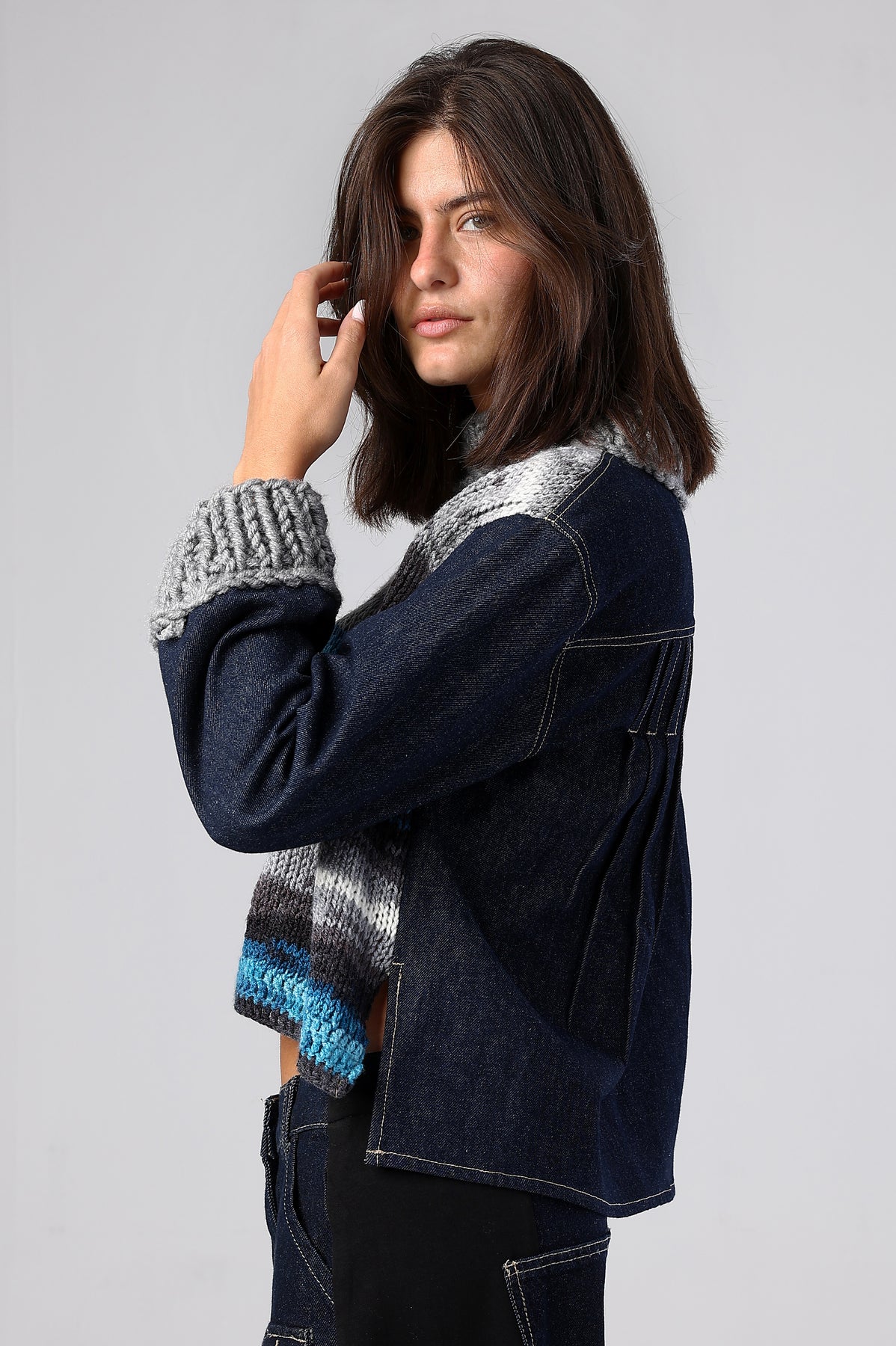 Elevate your everyday with The Rebellion Knit by FAZZALI, where luxurious knitwear meets the fearless edge of denim. Crafted for the unapologetically bold, this sweater features a soft, sculpted knit front, contrasted with a sleek denim back and sleeves, for a modern, urban twist. Knit-trimmed sleeves offer subtle yet striking detail, balancing comfort with avant-garde sophistication.