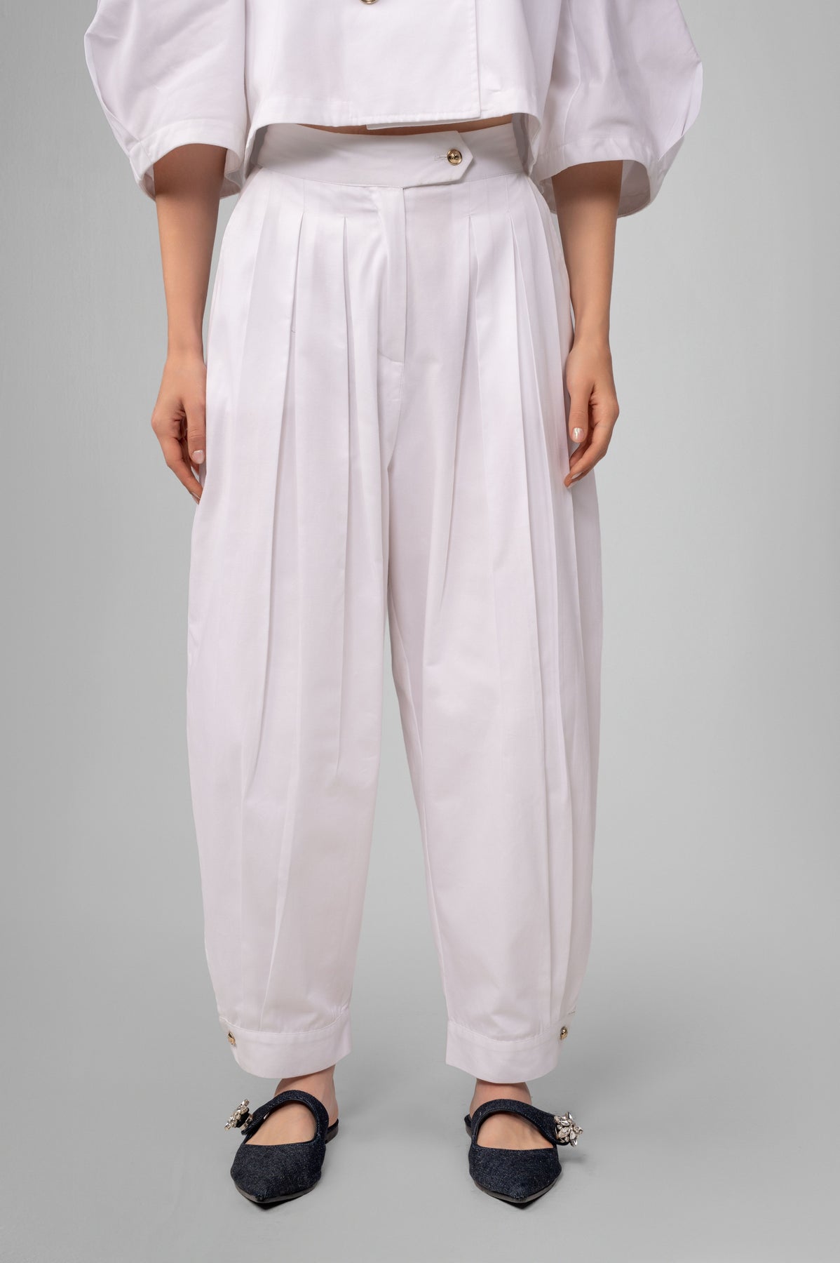 The high-rise waist frames the form with clarity, while polished gold buttons introduce a subtle statement of refinement. The fabric holds its structure yet softens in motion, allowing light and shadow to play across every fold. Neither rigid nor relaxed, The Sculpted Pants embody modern femininity — strong, balanced, and impeccably poised.