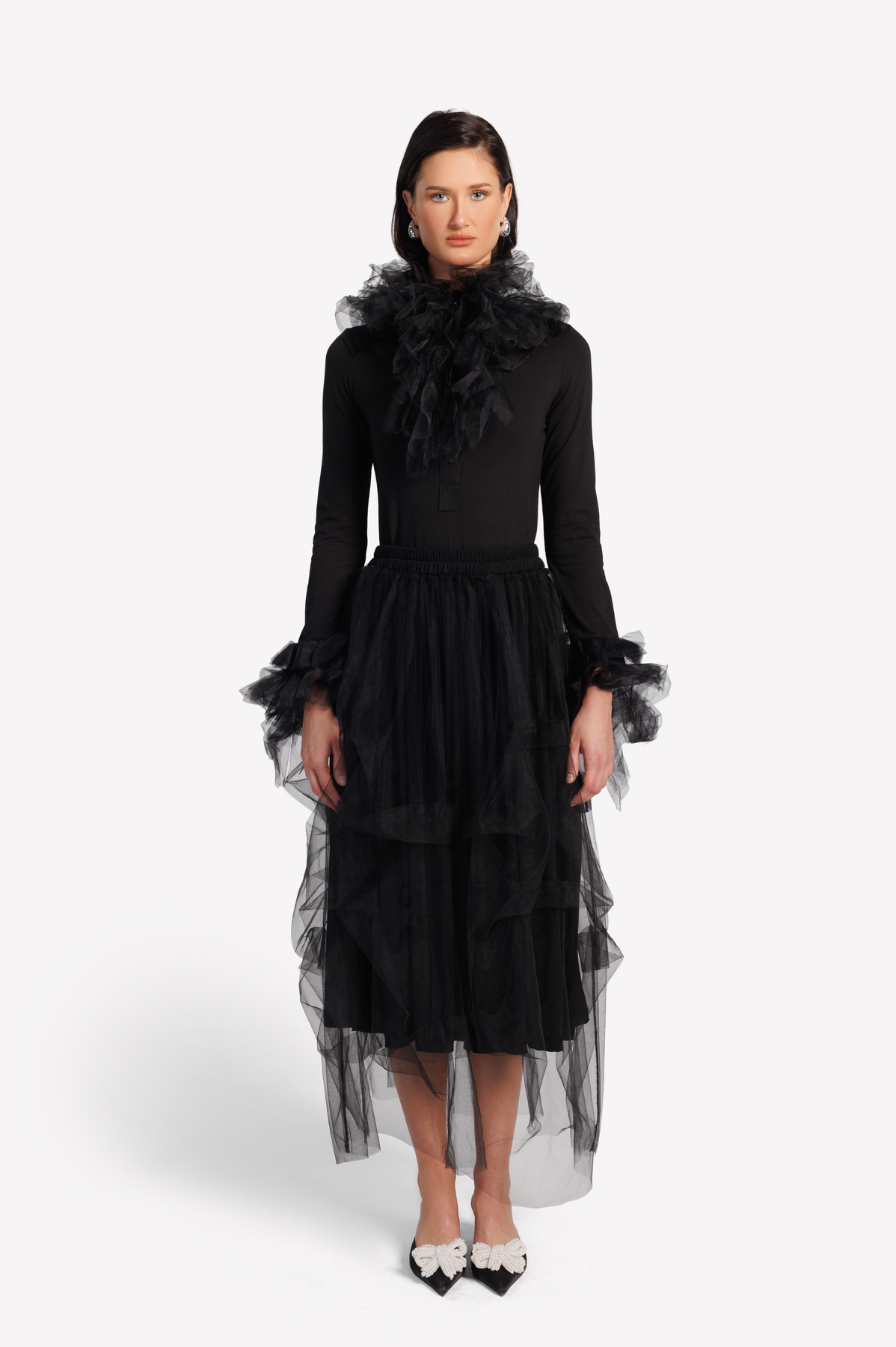 Delicate as a breeze and sculptural in form, The Illume Skirt by FAZZALI brings ethereal elegance to life. Crafted from whisper-light organza with a tulle-like texture, it floats around the body in soft, layered volume. The high-waisted silhouette flatters while creating graceful movement with every step, whether styled for a gallery event, a modern soirée, or an elevated day look.